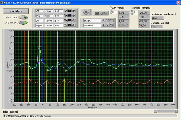 Um die Daten mit dem PC zu erfassen und darzustellen bieten wir ebenfalls ein Labview basierte Software "AICR" mit benutzerfreundlicher GUI zur simulatanen Erfassung von 4 ereigniskorrelierten Potentialen an. Die Software beinhaltet Elemente zur Datenvorfilterung, der flexiblen Aufnahmekonfiguration und für die Peak-/Latenz-Bestimmung.